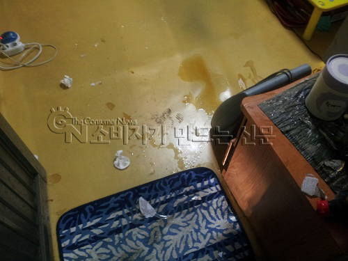깜짝 놀란 정 씨가 달려가 보니 내용물은 이미 바닥에 쏟아진 상태였고, 깨진 유리 파편이 방 곳곳에 널려 있었다.