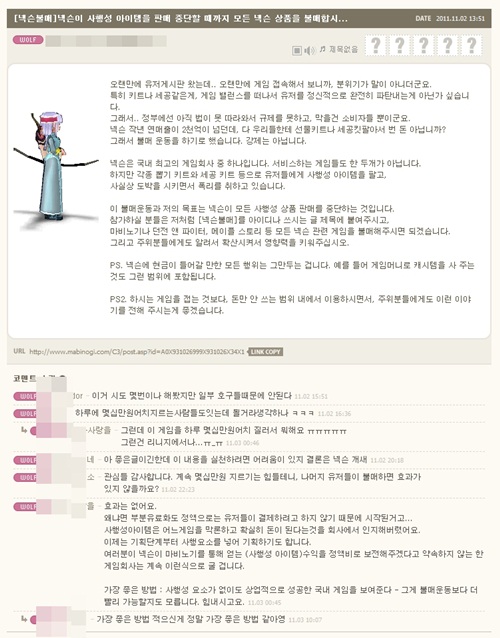 마비노기 이용자게시판에는 조 씨와 비슷한 생각을 가진 게이머들로 넘쳐 났다. “사행성 캐시템 판매가 중단돼야 한다”는 지적이 속출하고 있는 것.