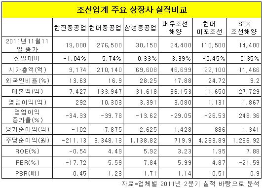 과거 조선 '빅5'에 들었던 한진중공업은 현재 현대미포조선과 STX조선해양에 밀려난지 오래 됐다. 수주실적이 저조해지면서 올 2분기 영업이익은 300억원에 불과, 현대중공업(1조303억원)과 343배나 차이가 난다. 분기당 순손실액이 수백억원으로 늘어나자 주가순자산비율(ROE) 등 재무안정지표도 악화됐다.