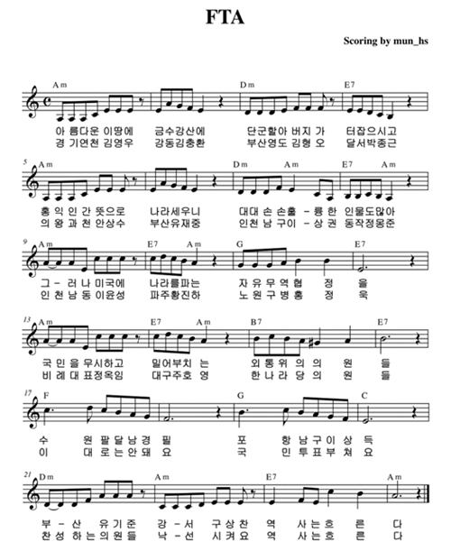 중앙선거관리위원회는 ‘한국을 미국에 팔아넘길 FTA 찬성 의원’이라는 제목으로 의원들의 실명이 포함된 악보(사진)를 게시한 네티즌을 검찰에 수사의뢰했다고 12일 밝혔다.