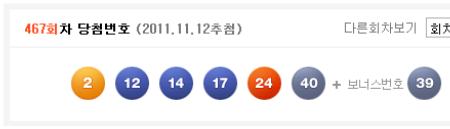 12일 제467회 로또복권을 추첨한 결과 '2, 12, 14, 17, 24, 40' 6개가 1등 당첨번호로 뽑혔다. 2등 보너스 번호는 '39'.