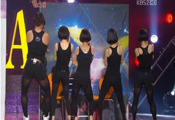 개그우먼 허민과 박지선, 개그맨 김지호는 헬스걸 이희경, 권미진과 함께 단발머리 가발을 쓰고 등장을 했다.