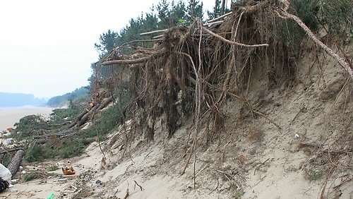 이 소나무 군락 바로 1~2m 옆에서는 사람들이 텐트를 치고 야영을 즐긴다. 방치가 지속되면 언제 쓰러질지 모르는 위태로운 상황이다. 바로 옆에 건축된 펜션에서도 해안가 바닥의 모래가 패여나가고있는 상황이다.