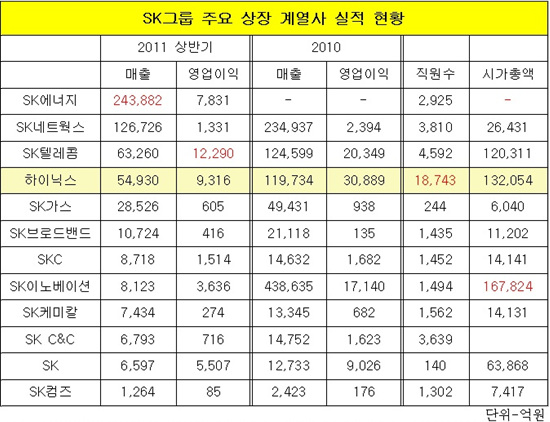 하이닉스는 올 상반기 개별 재무제표 기준 매출 5조5천억원으로 SK 계열사 가운데 SK에너지, SK네트웍스, SK텔레콤에 이은 4번째 덩치다.