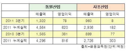 15일 관련업계에 따르면 동원산업의 3분기 매출액은 전년 동기대비 16% 감소한 1천322억원을 기록했으며 영업이익은 80% 감소한 78억원을 기록했다. 누계실적으로는 매출액 4천564억원을 달성해 전년 동기대비 6% 증가했으나 영업이익은 620억원으로 24%나 감소했다.