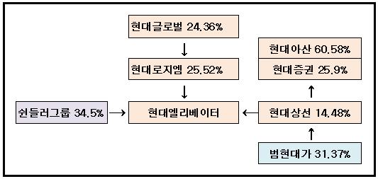 이에 따라 현대상선의 현대로지엠 지분율은 14.5%로 낮아진 반면, 현대글로벌은 17%에서 24.36%로 껑충 뛰었다. 현대엘리베이터의 경우 현대상선 지분 24.2%를 갖고 있다. 현대상선은 현대증권(25.9%), 현대아산(60.6%) 등의 최대주주다.