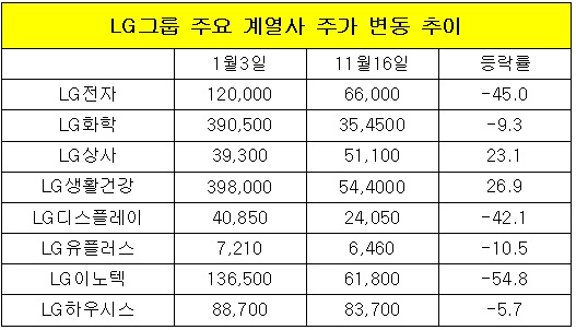 이 외 나머지 주요 계열사들의 주가는 내리막질 쳤으며 구본준 부회장의 LG전자(-45%)를 비롯해 LG디스플레이(-41.2), LG이노텍(-54.8)의 하락폭이 컸다.