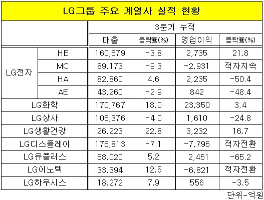 그룹 간판인 LG전자 사업부문별로는 생활가전을 담당하는 권희원 사장의 HE(Home Entertainment)사업본부 만이 2천735억원의 영업이익을 기록했다.