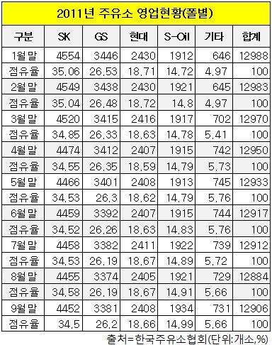 반면 에쓰오일은 올 1월 말 1천912개소(14.7%)에서 9월 말 1천934개소(15%)로 껑충 뛰었다. 또 이 기간 동안 농협이나 무폴 주유소가 646개소(5%)에서 731개소(5.6%)로 증가했다.