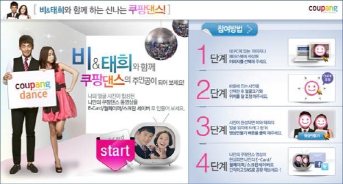 홈페이지 내 이벤트 페이지에서 참여하기를 누른 후 자신의 이미지를 선택해 크기와 위치를 조정한 후 비와 김태희 얼굴 중 하나에 적용하면 나만의 쿠팡 댄스 동영상이 완성된다.