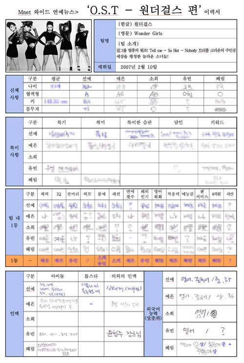 원더걸스의 자필 이력서에는 멤버들의 키와 몸무게, 취미, 습관, 인맥, 외국어 실력까지 모두 담겨있다.