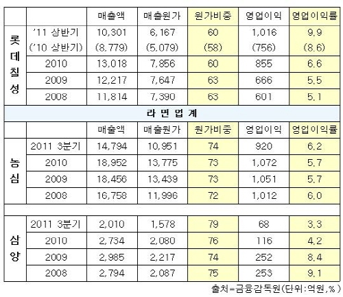 특히 라면업계의 경우 상대적으로 원가비중이 높다. 소맥분등 농심의 주요 매입 원재료 비중은 56% 정도다. 삼양식품은 올 3분기 원가비중이 79%에 이르며 영업이익률도 3.3%대로 하락했다.