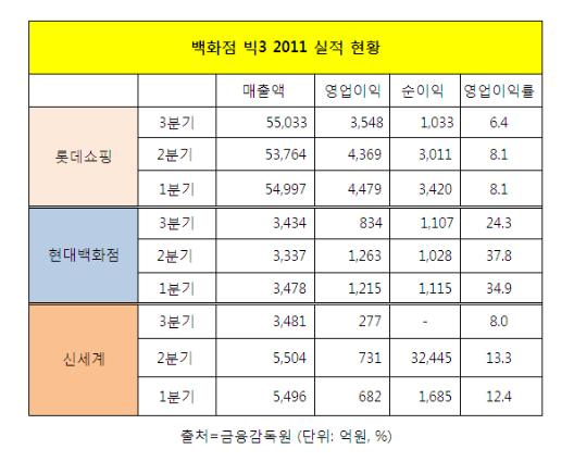 현대백화점은 3분기 매출액이 전년 동기대비 18% 증가한 3천434억원을 기록했다. 영업이익은 834억원으로 전년 동기 대비 14% 증가했다. 당기순익은 전년 동기 대비 29%나 풀쩍 뛰며 1천107억원을 기록해 외형과 내실 모두를 야무지게 챙겼다.