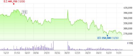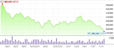 17일 롯데쇼핑 주가는 전 거래일 대비 1만1천500원(-3.18%)하락한 35만500원으로 장을 마감했다. 지난 6월 50만원 대를 돌파하며 기염을 토했지만 하반기 들어 실적 둔화로 주가도 바닥을 치고 있는 것이다.