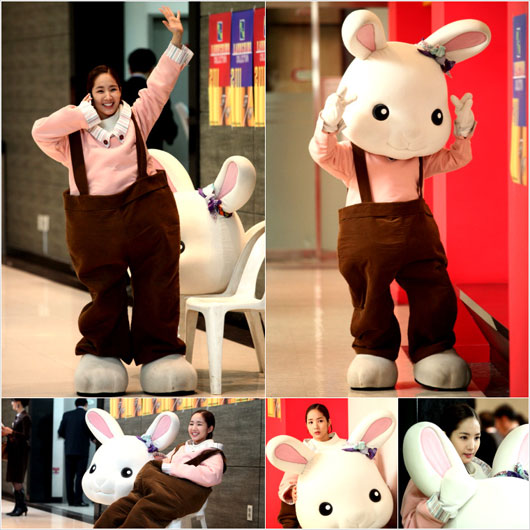 박민영은 ‘뒤뚱’거리며 걸어야 될 정도로 상당한 무게의 토끼 인형 옷을 입고 5시간 이상 촬영을 하는 투혼을 발휘했다.