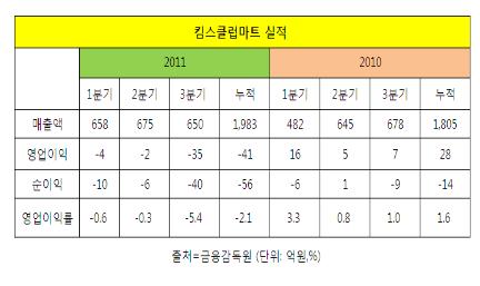 킴스클럽마트는 이마트가 인수에 뛰어든 지난 1분기에도 영업손실 4억원의 적자를 내긴 했지만 2분기에는 적자폭을 반으로 줄였다. 하지만 이마트 인수가 확실시 되고 난 후 수익성 악화가 가속화 되기 시작해 3분기에는 전기보다 손실이 16배 이상 커졌다.