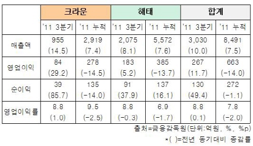 크라운-해태제과 합계 실적으로는 올 3분기 매출액 3천30억원, 영업이익은 267억원을 기록해 전년 동기대비 각각 10%, 12% 신장됐다. 순이익은 130억원으로 전년 동기대비 49% 증가했으며 영업이익률은 8.8%로 소폭(0.1%p) 개선됐다.