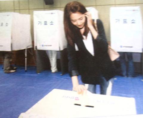 이는 사탐 교과서 중 선거와 투표를 다루는 내용에서 선거 날 투표를 하고 있는 윤아의 모습이 담긴 사진이 참고 사진으로 게재된 것이다.