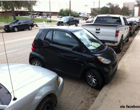 이 사진은 외국의 한 소형차 운전자가 주차된 차량들 사이에서 현명하게도 작은차만이 선보일 수 있는 직각주차를 선보였다.