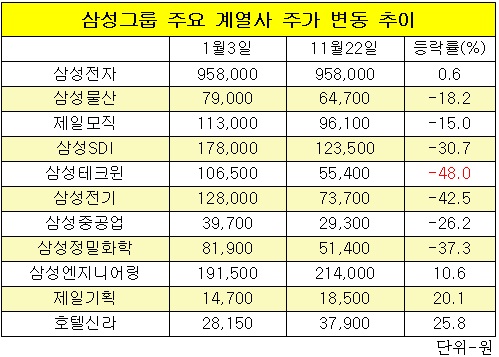 반면 삼성SDI를 비롯해 삼성전기, 삼성정밀화학 등은 30% 이상 주가가 떨어졌다. 삼성테크윈의 경우 하락폭이 48%로 가장 컸다.