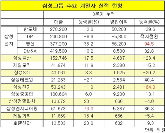 이 외에 삼성물산(사장 정연주), 삼성정밀화학(사장 성인희), 호텔신라(사장 이부진), 제일기획(사장 김낙회) 등의 계열사들이 전년 대비 15% 이상의 매출 신장세를 보였다. 다만 영업이익은 모두 마이너스 성장을 했다.