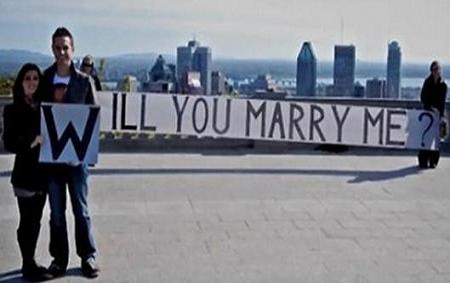마지막 알파벳 ‘W’를 들고 사진을 촬영하는 순간 여자 친구 몰래 두 명의 친구가 뒤에서 플랜카드를 펼쳐들었고 ‘Will You Marry Me?’(나와 결혼해 줄래?)라는 문장이 완성됐다.