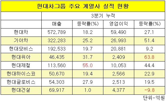 현대모비스(사장 전호석), 현대하이스코(사장 신성재), 현대글로비스(사장 김경배) 등도 20% 안팎의 매출 성장세를 보였다.