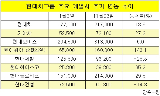 실적과 함께 또 다른 인사 평가 기준인 주가(23일 종가 기준)는 지난 2월 상장한 현대위아가 가장 두각을 나타냈다. 기아차와 현대하이스코, 현대글로비스 등도 주가가 연초 대비 25% 이상 상승했다. 현대차는 18.5% 상승했다.