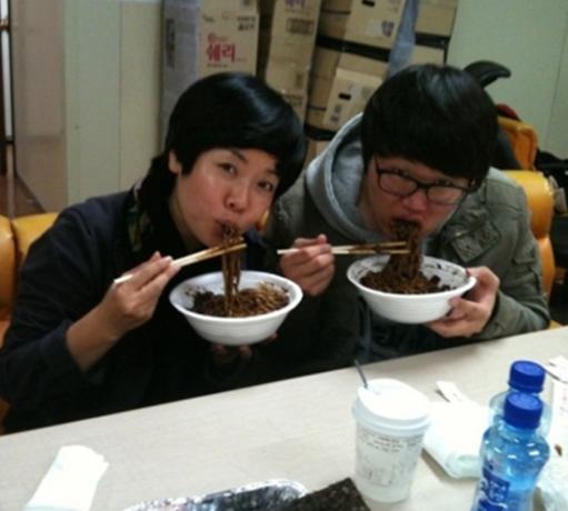 김미화와 후배 개그맨 최효종이 짜장면 먹는 모습이 화제다.