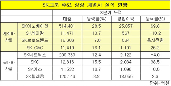 영업이익 측면에서도 SK이노베이션이 69.8%로 가장 높은 상승률을 기록했다. SK C&C는 26.2% 늘었다. 반면 국내파 가운데서는 SKC의 증가율이 38.5%로 가장 컸다. 그 외 SK가스가 10.5% 늘었을 뿐 SK네트웍스와 주력인 SK텔레콤은 부진했다.