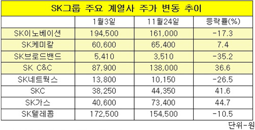 연초 대비 주가상승률(24일 종가기준)이 두각을 나타낸 곳은 SKC와 SK가스로 각각 41.6%와 44.7% 상승했다. 다만 SK네트웍스와 SK텔레콤은 실적과 마찬가지로 주가에서도 26.5%, 10.5% 하락하며 부진한 모습을 보였다.
