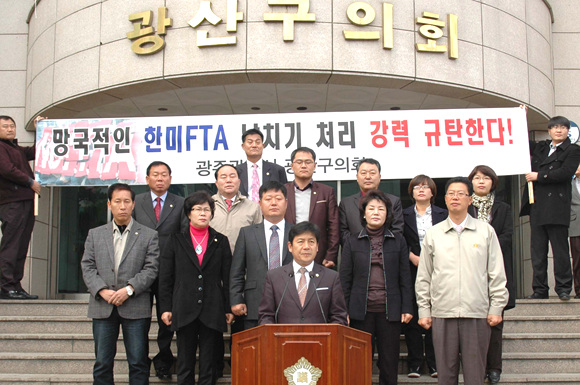 광산구의회(의장 이준열)는 24일 오전 광산구의회 앞에서 한미 FTA 날치기 처리 규탄 성명서를 채택하고 정부와 여당의 오만한 태도를 비판했다.
