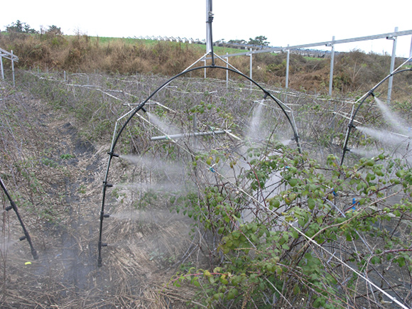 이번에 개발된 ‘∩’형 편이장비는 복분자 밭의 두둑방향과 직각이 되도록 공중에 트러스를 설치해 약제 살포시 5개의 두둑을 한번에 포함할 수 있도록 했으며 지주시설 위에 ‘∩’형태의 약대를 설치해 복분자를 감싸면서 살포할 수 있도록 제작됐다.