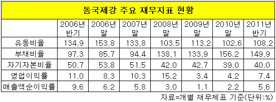 동국제강은 2006년 말 2조1천억원의 자기자본이 지난해 말 3조원으로 증가한 반면, 부채총액은 같은 기간동안 1조8천억원에서 4조5천억원으로 눈덩이처럼 불어났기 때문이다. 이에 따라 부채비율이 2006년 말 85.7%에서 지난해 말 156.2%로 껑충 뛰었다. 반기 재무제표를 기준으로 살펴보더라도, 2006년 상반기 97.3%였던 부채비율이 올 상반기 149.9%로 54.1% 증가했다.