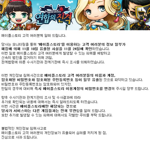 사과글에서 넥슨은 "당사는 모니터링을 통해 '메이플스토리'를 이용하는 고객 여러분의 정보 일부가 해킹에 의해 11월 18일 유출된 사실을 11월 24일에 확인했다"며 "이번 일로 '메이플스토리' 고객 여러분에게 발생할 수 있는 피해를 예방하고 신속히 범인을 검거하기 위해 25일, 관계법령에 따라 수사기관과 관계기관에 즉시 조사를 의뢰했다"고 밝혔다.