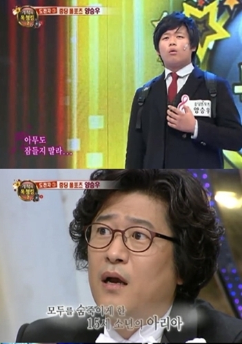 한편, 정승우 군은 1년 전인 중학교 1학년 때 선생님의 추천을 받고 성악을 시작했다며 제대로 배우지도 않은 상태에서 대회에 나가 우승을 했다고 밝혔다. (사진=SBS 방송캡쳐)