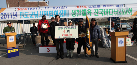 28일 진도군에 따르면 2011년 진도군낚시연합회장배 생활체육 전국바다낚시대회가 지난 27일(일) 조도면 일원에서 열려 ‘박재남·이영두’팀이 감성돔 57cm를 낚아 1위를 차지, 상금 300만원과 트로피 등을 부상으로 전달 받았다.