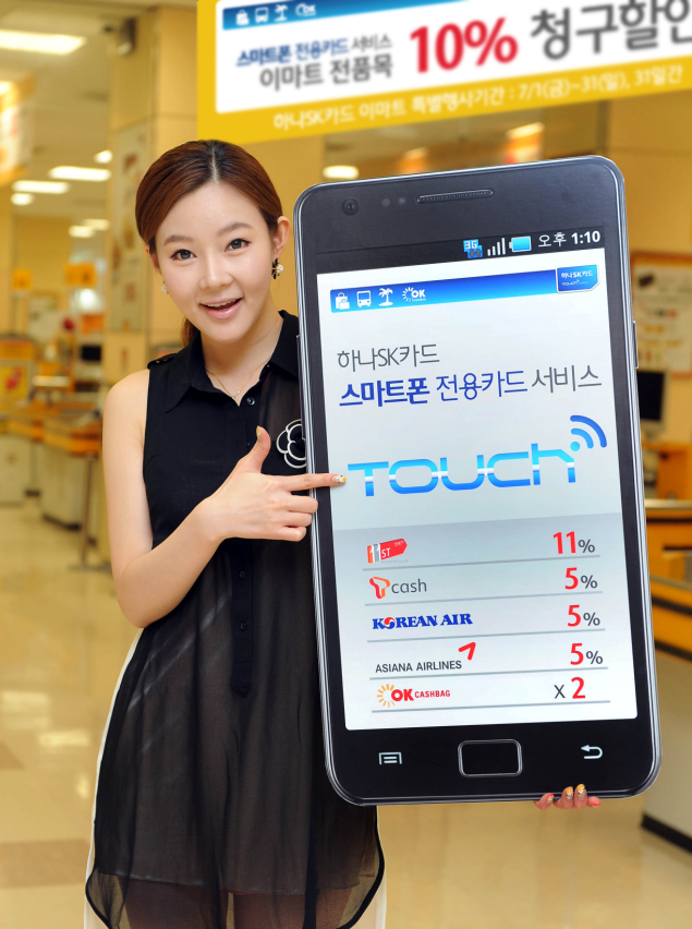 스마트폰을 활용한 모바일 금융서비스도 확대됐다. 스마트폰에서 ‘하나SK카드 터치 스탬프 서비스’ 애플리케이션을 다운로드 받으면 하나SK카드로 일정금액을 결제할 때마다 해당 가맹점에서 사용 횟수가 스마트폰에 스탬프 형태로 자동 적립된다. 옥션에서 3만원 이상 결제하면 스탬프가 1개 찍히고 스탬프가 3개 모이면 15% 할인 쿠폰이 스마트폰으로 자동 발급되는 방식이다.