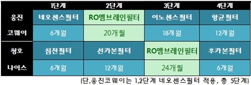 역삼투압방식 정수기 핵심 필터인 ‘RO멤브레인 필터’의 경우 청호나이스의 교체주기가 2년(24개월)인데 반해 웅진코웨이는 20개월로 4개월 짧다.