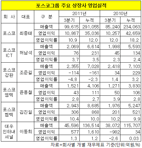 올 3분기 포스코그룹의 주요 상장사 가운데 최종태, 허남석, 김진일 사장의 성적표가 상대적으로 양호한 것으로 나타났다.
