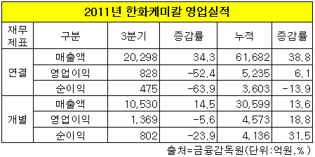 2일 금융감독원에 따르면 한화케미칼의 올 3분기 매출액(연결기준)은 2조원으로 지난해 1조5천억원에서 34.3% 증가했으나 영업이익은 828억원으로 반토막 났다.
