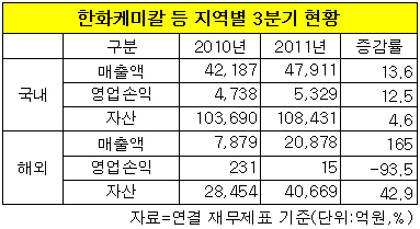 한화케미칼 등 국내 법인의 매출액과 영업이익은 지난해보다 두자릿수로 증가했다. 이와 달리 태양광사업을 중점 추진중인 한화솔라원 등 해외 법인의 매출액은 8천억원에서 2조원으로 165% 급증할 동안 영업이익은 231억원에서 15억원으로 93% 이상 하락했다.
