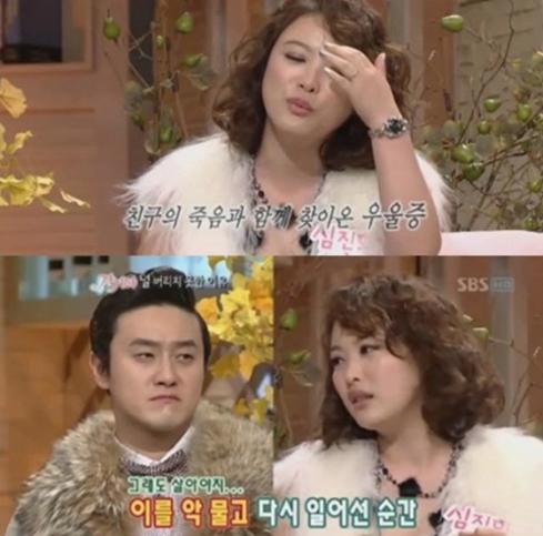 심진화는 지난 1일 방송된 SBS `스타부부쇼 자기야`에 출연해 친구 개그맨 故 김형은의 죽음과 아버지를 잃은 슬픔으로 자살을 결심했던 사실을 털어놨다.