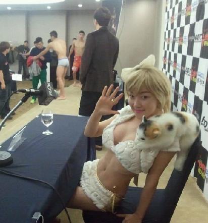 낸시랭은 2일 트위터에 “지금 선수들과 계체량 기자회견 중~^^ 내일 Road FC종합격투기 때하는 선수들과 의례하는 기자회견이라고 한다~ 내일 시작되는 경기에서 낸시랭 라운드걸 퍼포먼스와 뜨거운 경기 함께 재밌게 즐겨주세용~^^”이라며 라운드걸 복장을 공개했다.