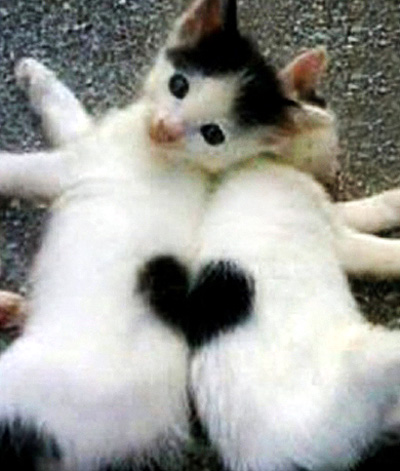 사진 속에는 비슷하게 생긴 두 마리의 고양이가 등을 맞대고 누워 있었는데, 등 위에 있는 검은색 무늬가 맞닿으면서 하트 모양을 만들어냈다.