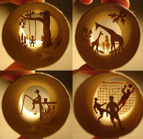 동그란 휴지심 안에는 나무그네를 타는 아이와 낚시를 하는 모습 등이 섬세하게 표현돼 있어 감탄을 자아낸다.