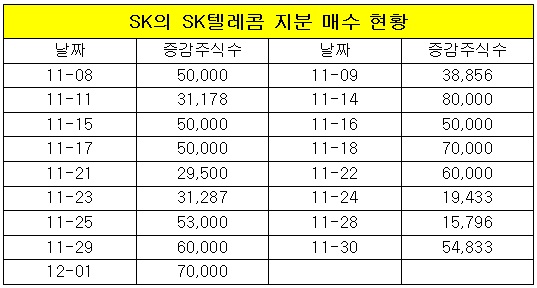 이 같은 주가 급락이 이어지자 SK는 11월8일부터 하루나 이틀 간격으로 꾸준히 SK텔레콤 주식 매수에 나섰다. 특히 SK텔레콤이 하이닉스 우선협상대상자에 선정된 이후 매수 규모를 더욱 늘렸다. 14일 8만주, 15일부터 17일까지 각각 5만주 그리고 18일 다시 7만주를 매수 했다.