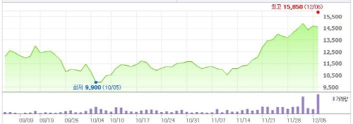 매일유업의 주가는 6일 전일 대비 100원(-0.68%)하락한 1만4천600원에 거래를 마쳤다. 장 중에는 최근 3개월 중 최고가인 1만5천850원까지 치솟기도 했다. 지난 10월 5일 9천900원까지 떨어져 연중 최저가를 찍은 후 반등에 성공해 2달 만인 현재 50%에 가까운 급등세를 이어가는 중이다.