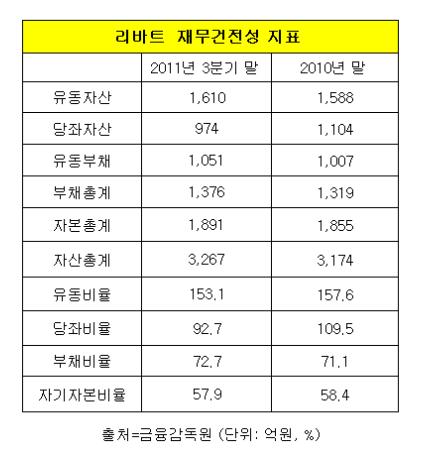 6일 금융감독원 보고서에 따르면 리바트는 3분기 말 기준 유동비율, 당좌비율, 부채비율 등 대표적인 재무건전성 항목에서 안정적인 수치를 보였다. 건설경기 침체로 대부분의 가구사들이 경영난에 허덕이는 상황과 대조적이다.