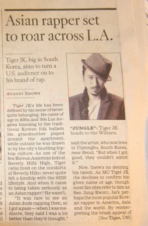 지난 2일, 미국 LA에서 타이거 JK와 윤미래 등 정글 엔터테인먼트가 이끄는 ‘M-Live by CJ 정글콘서트 in LA’가 성공적으로 개최된 가운데, LA 최대 유력 매체인 ‘LA타임즈’가 한국의 래퍼인 타이거 JK의 일대기를 1면으로 상세히 다루며 한국 힙합의 미국 진출에 높은 관심을 드러냈다.